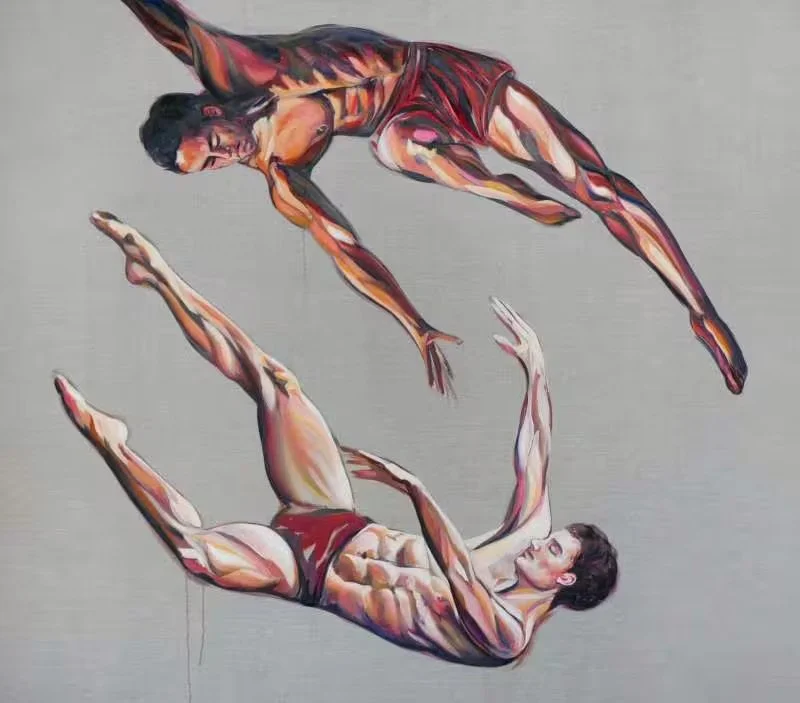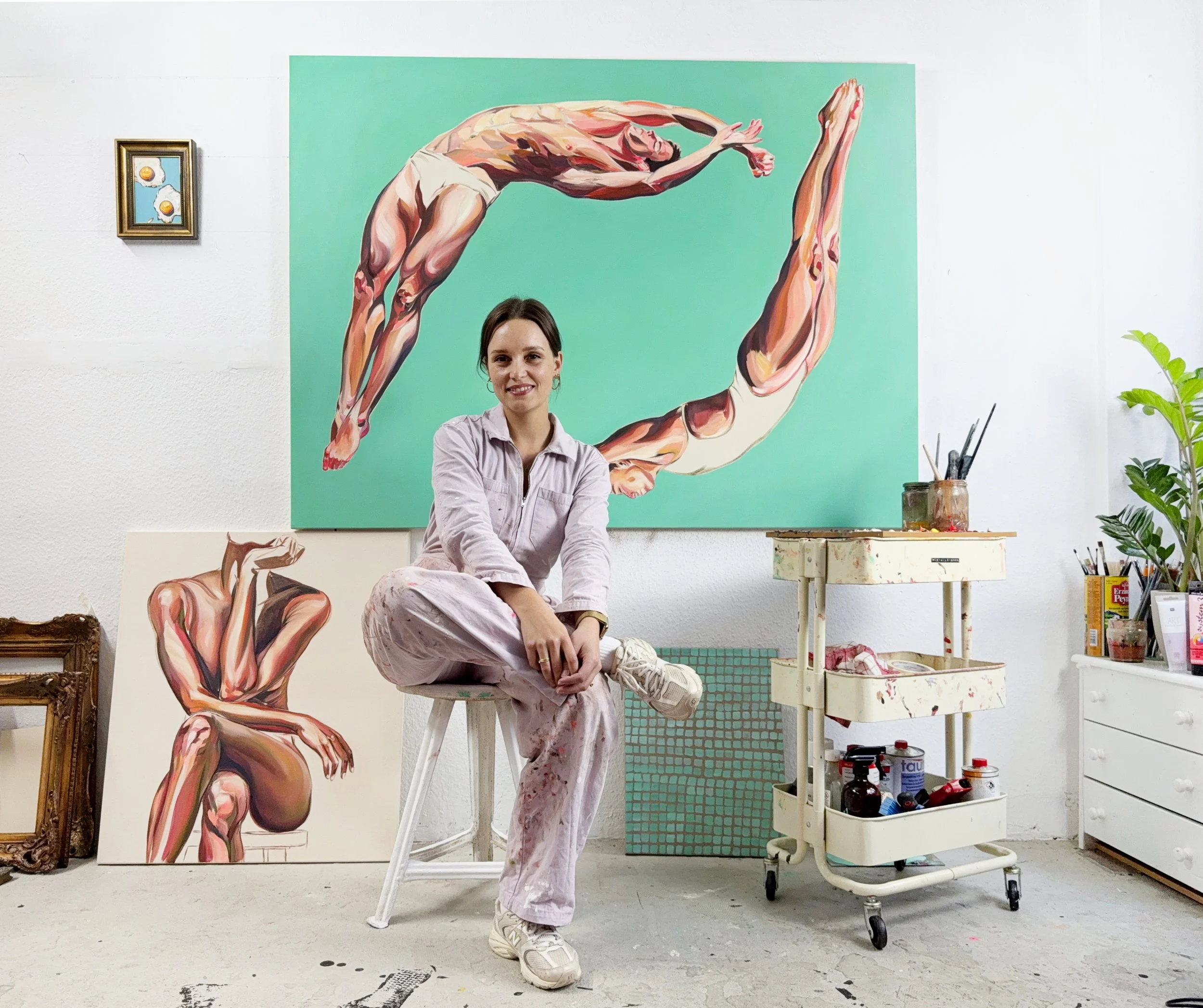 Maria Leisner, Absolventin der Staatlichen Akademie der Bildenden Künste Stuttgart, fängt die Poesie der Bewegung und weibliche Identität ein, oft durch dynamische Darstellungen von Körpern, die ins Wasser eintauchen.