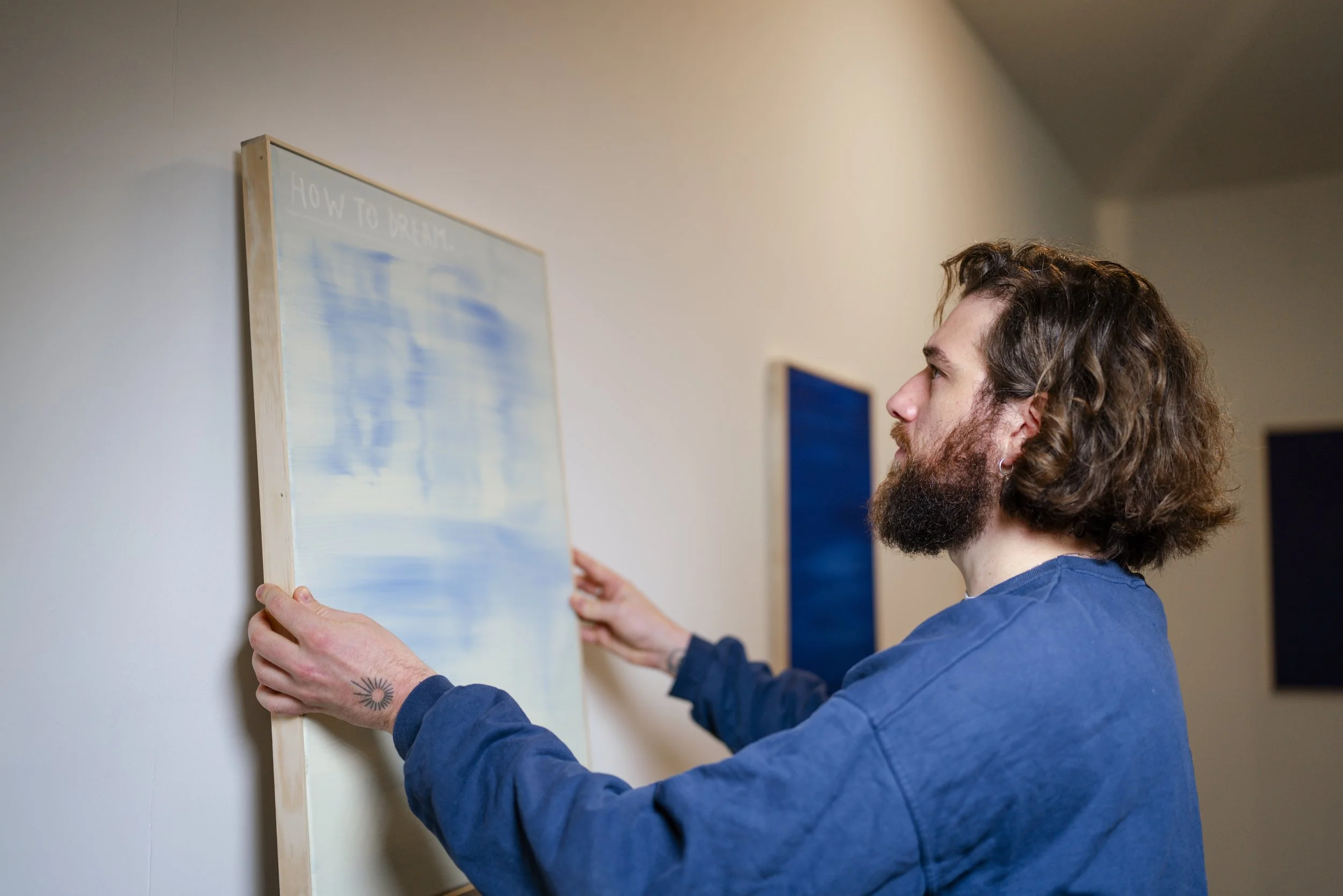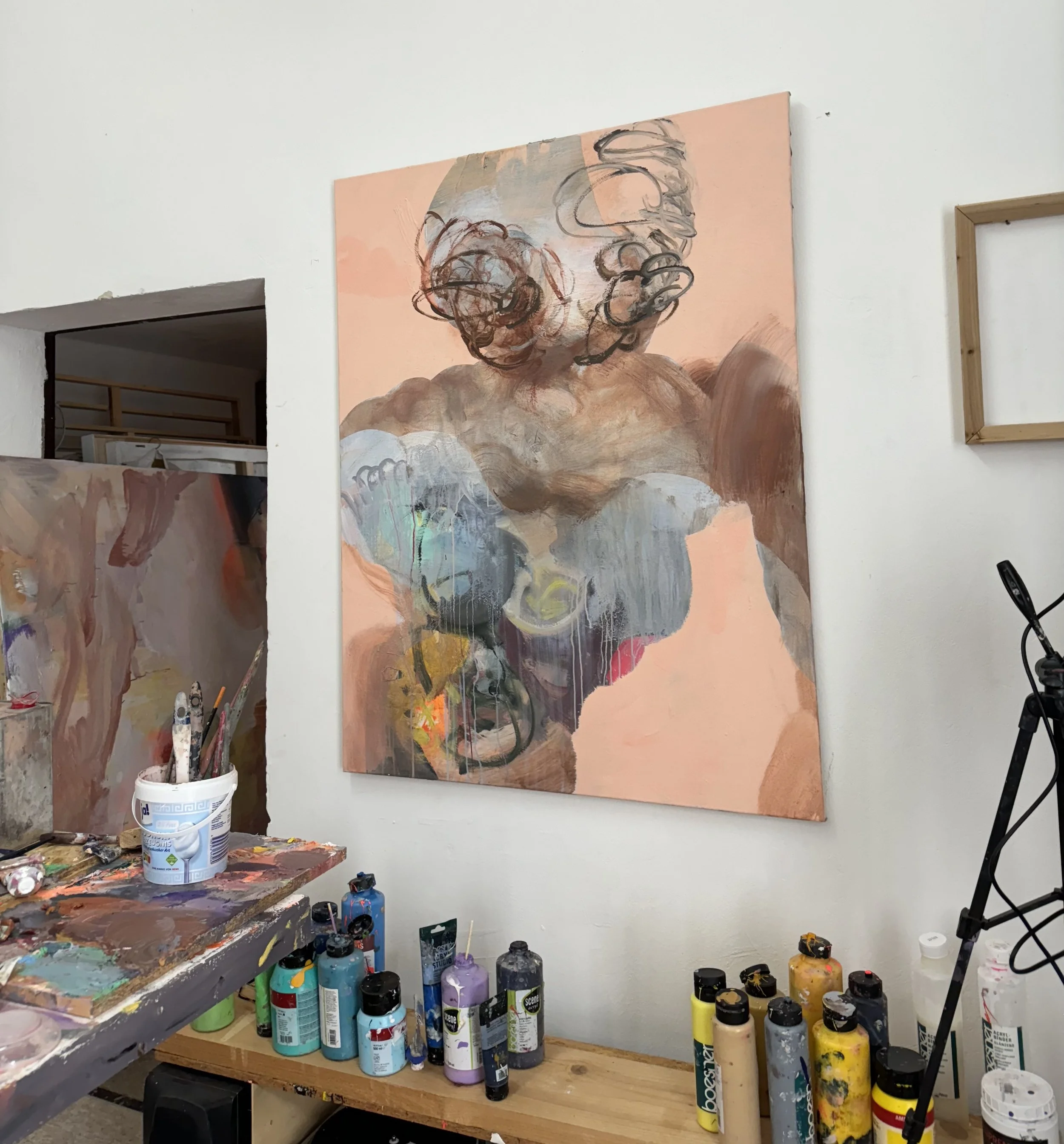 Lilli Geyer, Bachelor-Studentin an der MSD Münster, integriert oft die natürliche Maserung ihrer Holz-Bildträger in ihre Kompositionen und lässt Arbeitsspuren bewusst sichtbar. Ob Mode als Kommunikationsmittel oder das Geheimnis eines leeren Raumes – sie sucht im scheinbar Banalen nach Ausdrucksstärke und fängt Lichtstimmungen stets live vor Ort ein.